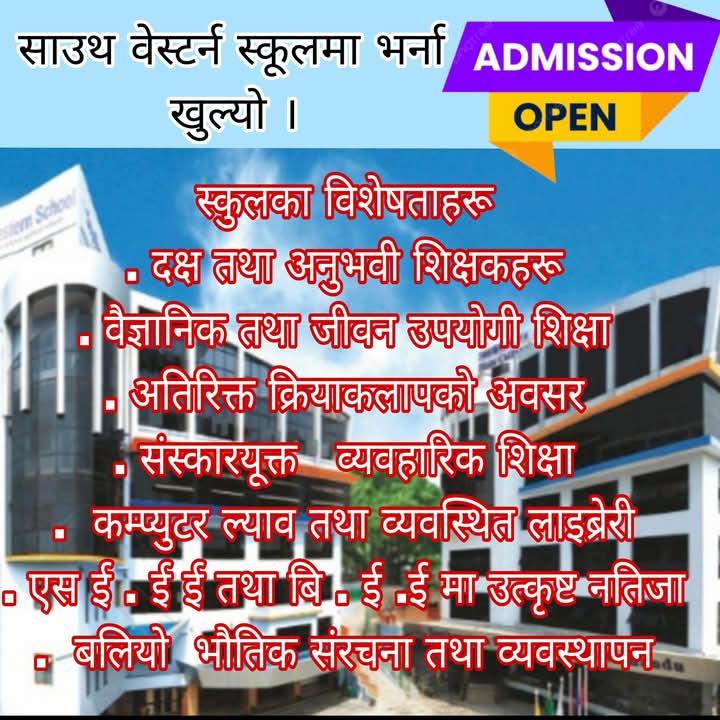 नयाँ वर्ष २० ८२ को देश विदेशमा रहेका सम्पूर्ण नेपाली दाजुभाइ तथा दिदीबहिनीहरु एवम् विद्यालय परिवारका विद्यार्थी , अभिभावक ,शिक्षक तथा कर्मचारीहरूमा हार्दिक मंगलमय शुभ-कामना व्यक्त गर्दछौं – साउथवेस्टर्न स्कुल परिवार ,वसुन्धरा काठमाडौँ