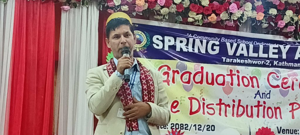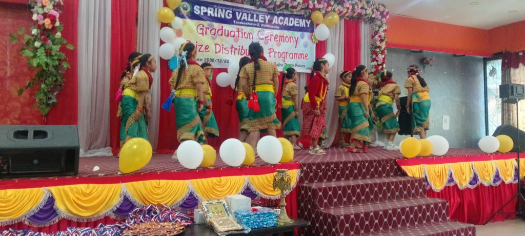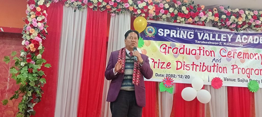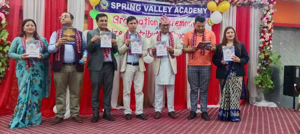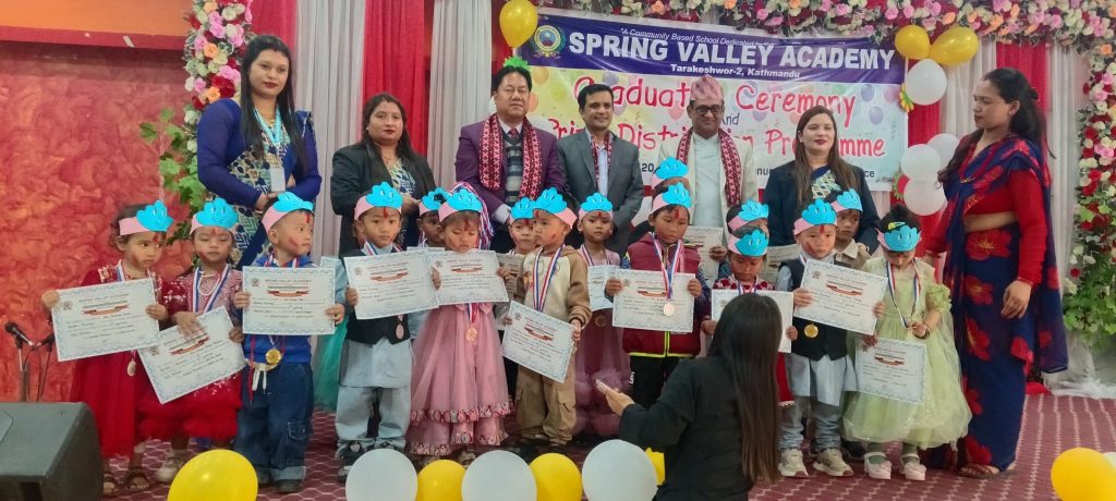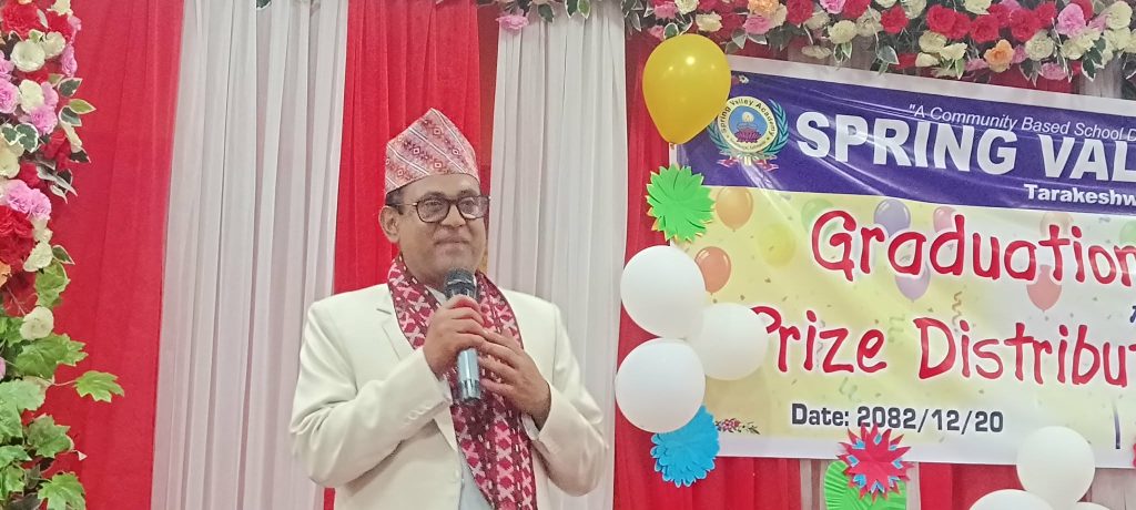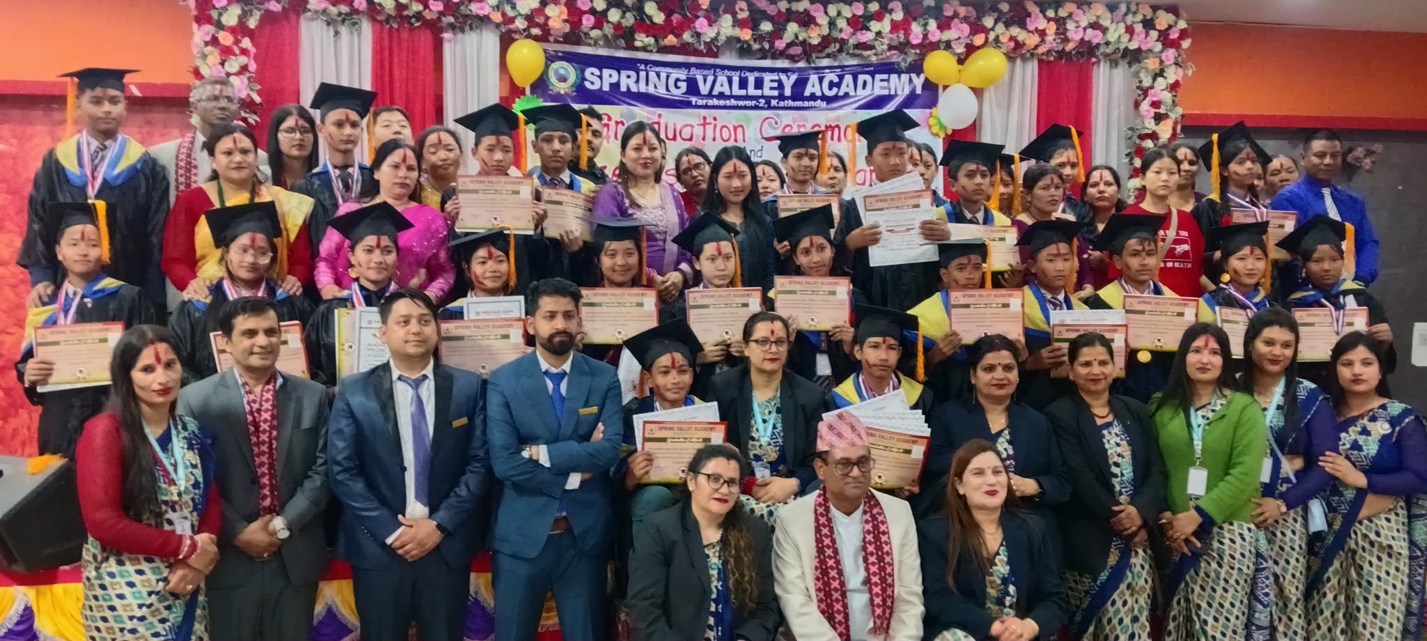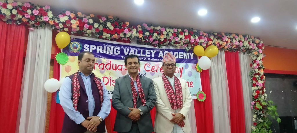 तारकेश्वर नगरपालिका -२ मा रहेको स्प्रिङ भ्याली एकेडेमीको आयोजना , तारकेश्वर नगर शिक्षा प्रमुख सुदिनराज बुढाथोकीको प्रमुख आतिथ्यता तथा स्कुलका सञ्चालक समितिका अध्यक्ष विष्णु प्रसाद आचार्यको सभाध्यक्षतामा दीक्षान्त तथा पुरस्कार वितरण समारोह सम्पन्न गरिएको छ ।